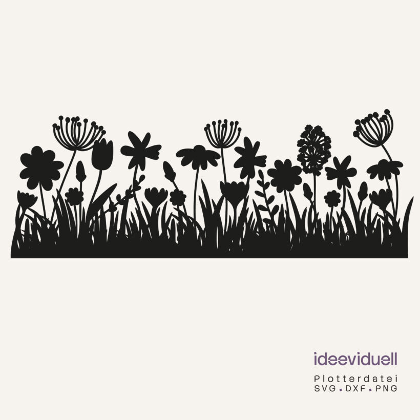 Diese Plotterdatei enthält eine Blumenwiese als Silhouette als Datei in den Formaten SVG, DXF und PNG (Download von allen drei als ZIP-Datei).
